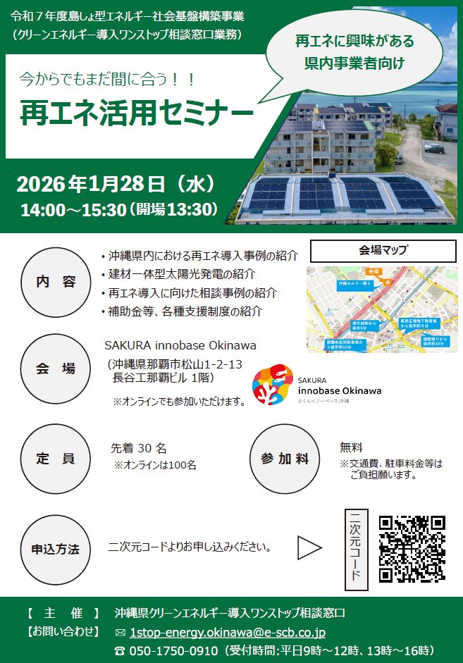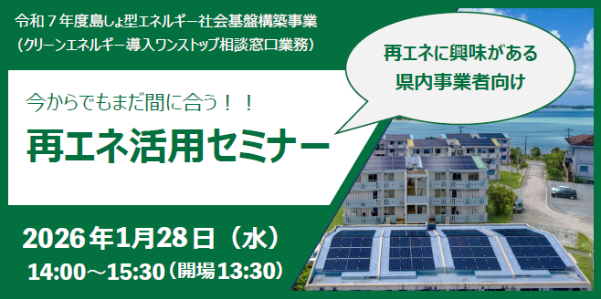 2026年1月28日(水)、SAKURA innobase Okinawaとオンラインのハイブリット開催にて、民間事業者様向け「再エネ活用セミナー」を開催いたします。